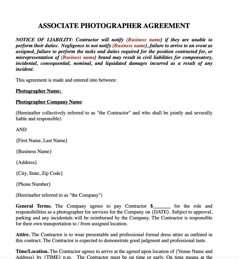 This customizable Associate Shooter Agreement is perfect for photographers looking to hire or work as a second shooter for weddings and events. It clearly outlines expectations, payment terms, usage rights, confidentiality, and more, protecting both parties and ensuring a smooth collaboration. Ideal for professional photographers who want to secure clear and professional agreements with their associate shooters. Download, edit, and use it as many times as needed!